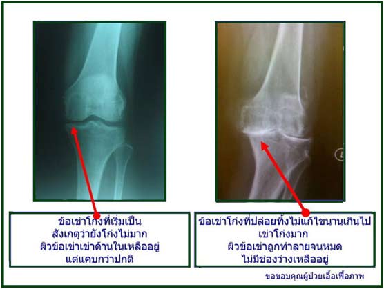 น้ำหนักตัวที่กดลงมาข้อเข่าที่โก่ง จะไม่ถูกกระจายไปที่ผิวข้ออย่างที่ควรจะเป็นครับ แต่จะกระจุกตัวอยู่ที่ฝั่งด้านในของเข่าทั้งสองข้าง เมื่อแรงกระเทือนที่ข้อเข่าเกิดขึ้นซ้ำ ๆ กันหลาย ๆ หน (คนเราเดินเฉลี่ยวันละ 5,000-8,000 ก้าว)